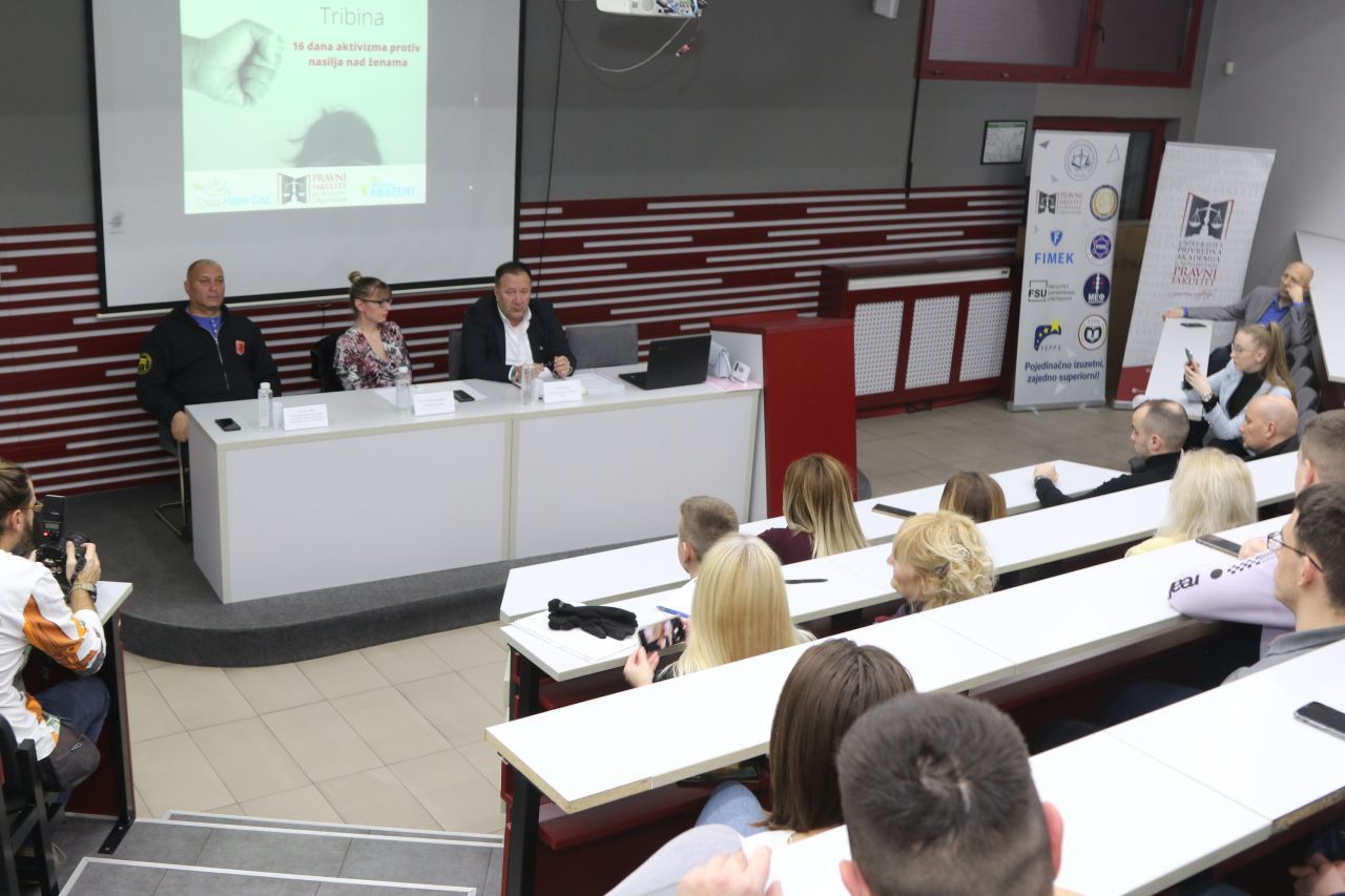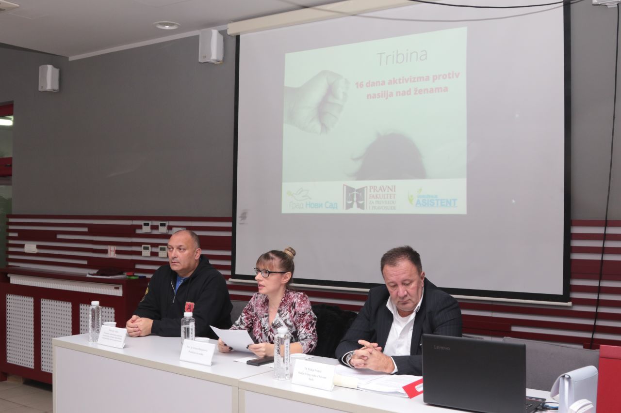 O fenomenološkim karakteristikama nasilja nad ženama, uzrocima, krivičnopravnom tretmanu i primerima iz prakse govorili su učesnici tribine: dr Vidoje Mitrić, sudija Višeg suda u Novom Sadu, prof. dr Jelena Matijašević, prodekan za nauku i glavna urednica naučnog časopisa „Pravo – teorija i praksa“ i Milorad Jakić, predsednik međunarodnog udruženja telohranitelja, instruktor samoodbrane, telohraniteljske zaštite i protivterorizma.