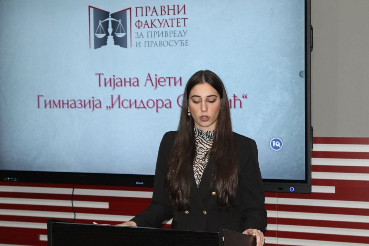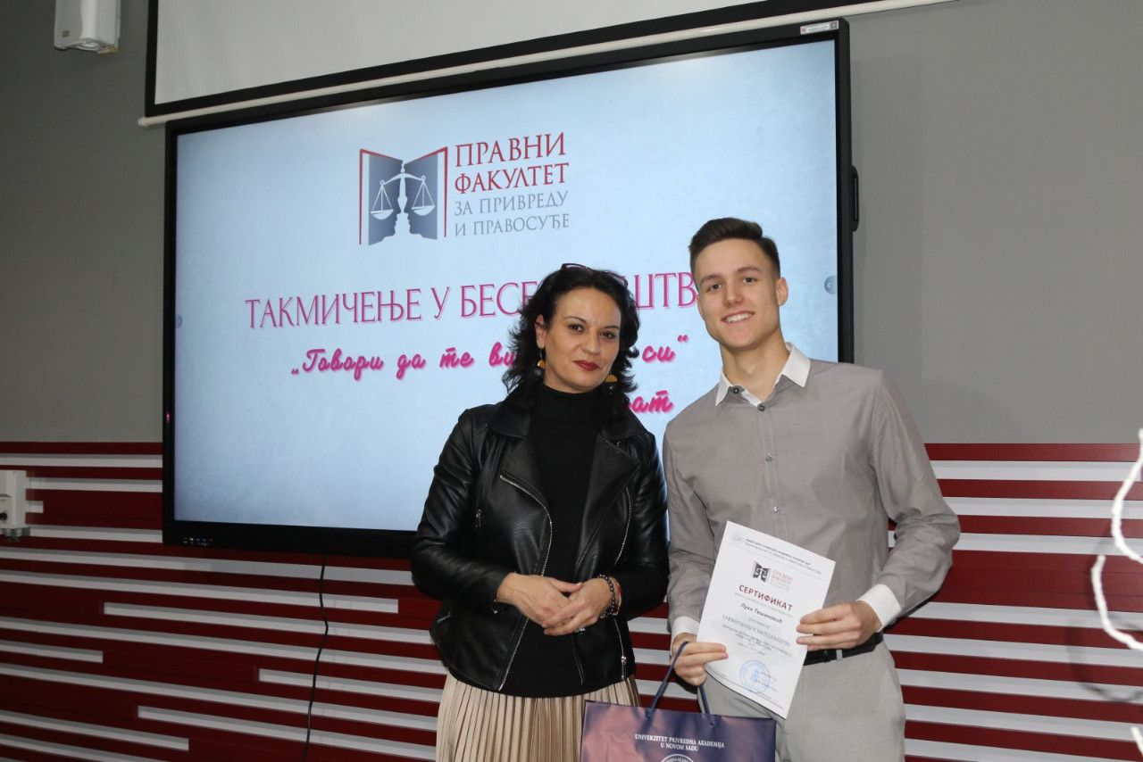 Prisutne je pozdravila i jedna od članica žirija sa izuzetno delikatnim zadatkom „odmeravanja“ i procenjivanja bezmalo jednako dobrih izlaganja bila je prof. dr Marijana Dukić Mijatović, državna sekretarka u Ministarstvu prosvete Vlade RS, koja je izrazila veliko zadovoljstvo mogućnošću da bude deo ovog uglednog takmičenja na jednoj visokoškolskoj ustanovi koja kao tradiciju ima takmičenje u besedništvu duže od jedne decenije. „Kao predstavnik Ministarstva prosvete mogu izuzetno afirmativno da se osvrnem na sam događaj i na učesnike, maturante i studente. I za jedne i za druge je od nemerljive važnosti negovanje oratorstva. Bez sistematizovanog znanja nema dobre besede, jer jedino tako možemo uveriti sagovornika u naše pravne, naučne, religijske i svake druge stavove. Zato besedništvo mora da se neguje, kao i tradicija, čitanje. Generacije novog milenijuma su vrlo vešte u digitalnoj tehnologiji koja nam je vrlo bitna i kojoj posvećujemo pažnju. Mnogo smo uložili i u digitalizaciju obrazovanje. Ali naš identitet, našu književnost, duh našeg naroda i besedništva treba negovati posebno kod mladih ljudi koji žele da se bave pravnom strukom, jer ovde se školuju buduće sudije, advokati, tužioci kojima je govor i reč alat u njihovom budućem zanimanju i primeni zakona“- izjavila je povodom ovog događaja državna sekretarka.