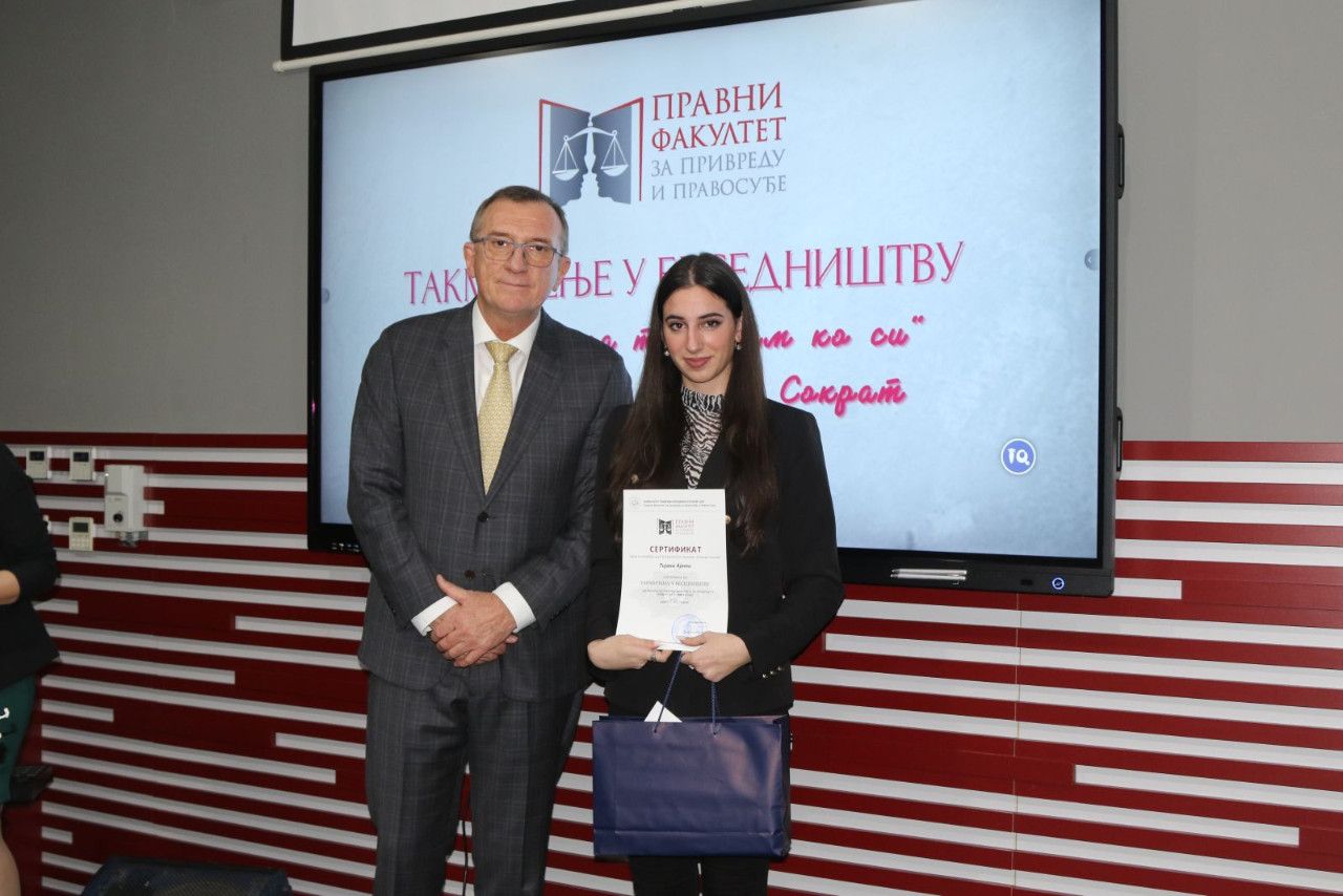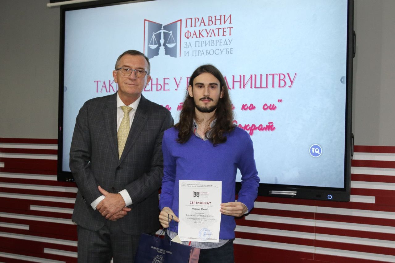 Pre proglašenja pobednika prof. dr Biljana Đurović, izvela je „Karnalutijevu uzvišenu besedu“, a zatim dodelila svim učesnicima sertifikate. Prof. dr Marijana Dukić Mijatović, proglasila je pobednicu u kategoriji zadata tema i dodelila nagradu, dok je prof. dr Milan Počuča, proglasio pobednika u kategoriji slobodna tema i dodelio nagradu pobedniku. Nikolina Grahovac, studentkinja druge godine Pravnog fakulteta za privredu i pravosuđe, VŠJ Subotica je osvojila popust od 30% na školarinu za narednu školsku godinu i putovanje za dvoje u Beč, dok je maturant David Bugarski iz gimnazije „Jovan Jovanović Zmaj“ za prvo mesto nagrađen popustom od 50% za prvu godinu Pravnog fakulteta za privredu i pravosuđe i tablet računarom.