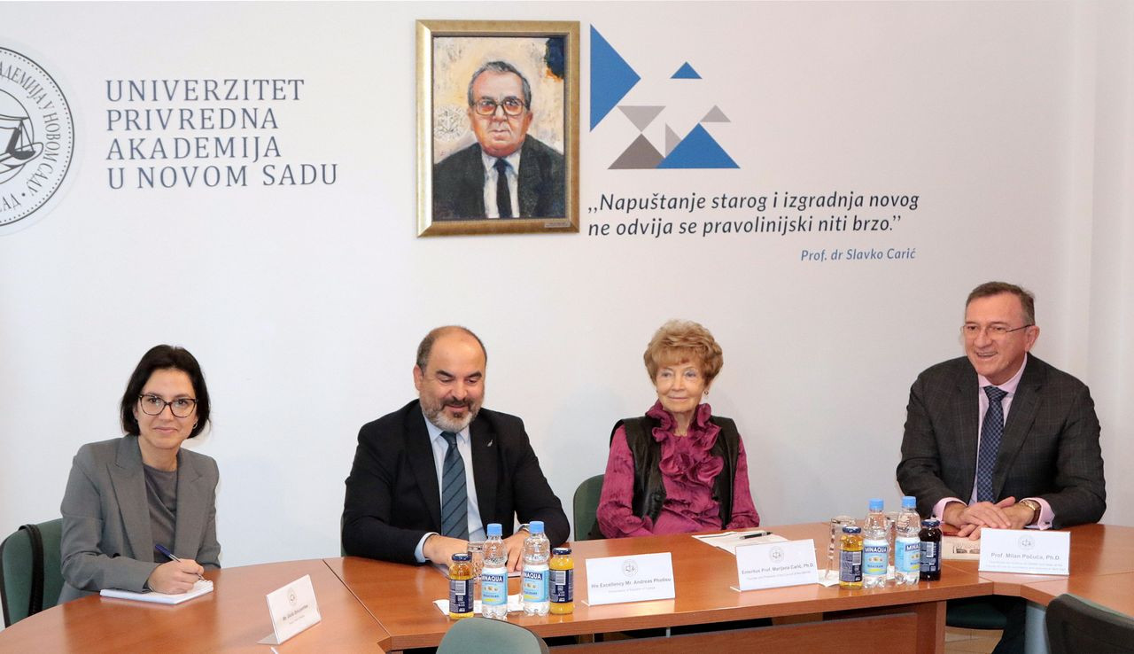 Njegova Ekselencija gospodin Andreas Fotiu, Ambasador Republike Kipar u Srbiji posetio je Pravni fakultet za privredu i pravosuđe Univerzitet Privredna akademija u Novom Sadu u petak, 29. novembra 2024. godine gde su ga svečano dočekali emeritus prof. dr Marijana Carić, predsednica Saveta Univerziteta Privredna akademija, prof. dr Milan Počuča, dekan Pravnog fakulteta za privredu i pravosuđe, prof. dr Predrag Mirković, predsednik Saveta Pravnog fakulteta za privredu i pravosuđe, prof. dr Marijana Mladenov, prodekanka za međunarodnu saradnju Pravnog fakulteta za privredu i pravosuđe, prof. dr Maja Petrović, prodekanka za kvalitet i razvoj Pravnog fakulteta za privredu i pravosuđe i Tamara Krstić, direktorka marketinga Univerziteta Privredna akademija.